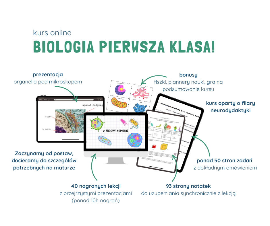 Jeśli potrzebujesz wsparcia w przyswojeniu materiału z pierwszej klasy (on jest serio kluczowy, żeby potem się nie gubić w kolejnych latach), to zerknij na mój kurs Biologia Pierwsza Klasa! – tłumaczę w nim wszystko, krok po kroku, zapewniam notatki, zestawy zadań i dodatkowe pomoce typu fiszki. Prowadzę Cię w nim krok po kroku, niczym nie musisz się martwić.