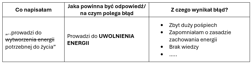 Każdy błąd to okazja do wyciągnięcia wniosków i poprawy. Warto je notować, bo tak dużo łatwiej przyjrzeć się błędom i je przeanalizować. To nie musi być zeszyt, może być tabelka w excelu albo plik tekstowy w Wordzie. Chodzi o to, żeby wynotowywać swoje błędy z zadań i się na nich uczyć. Możesz to prowadzić w formie tabeli: